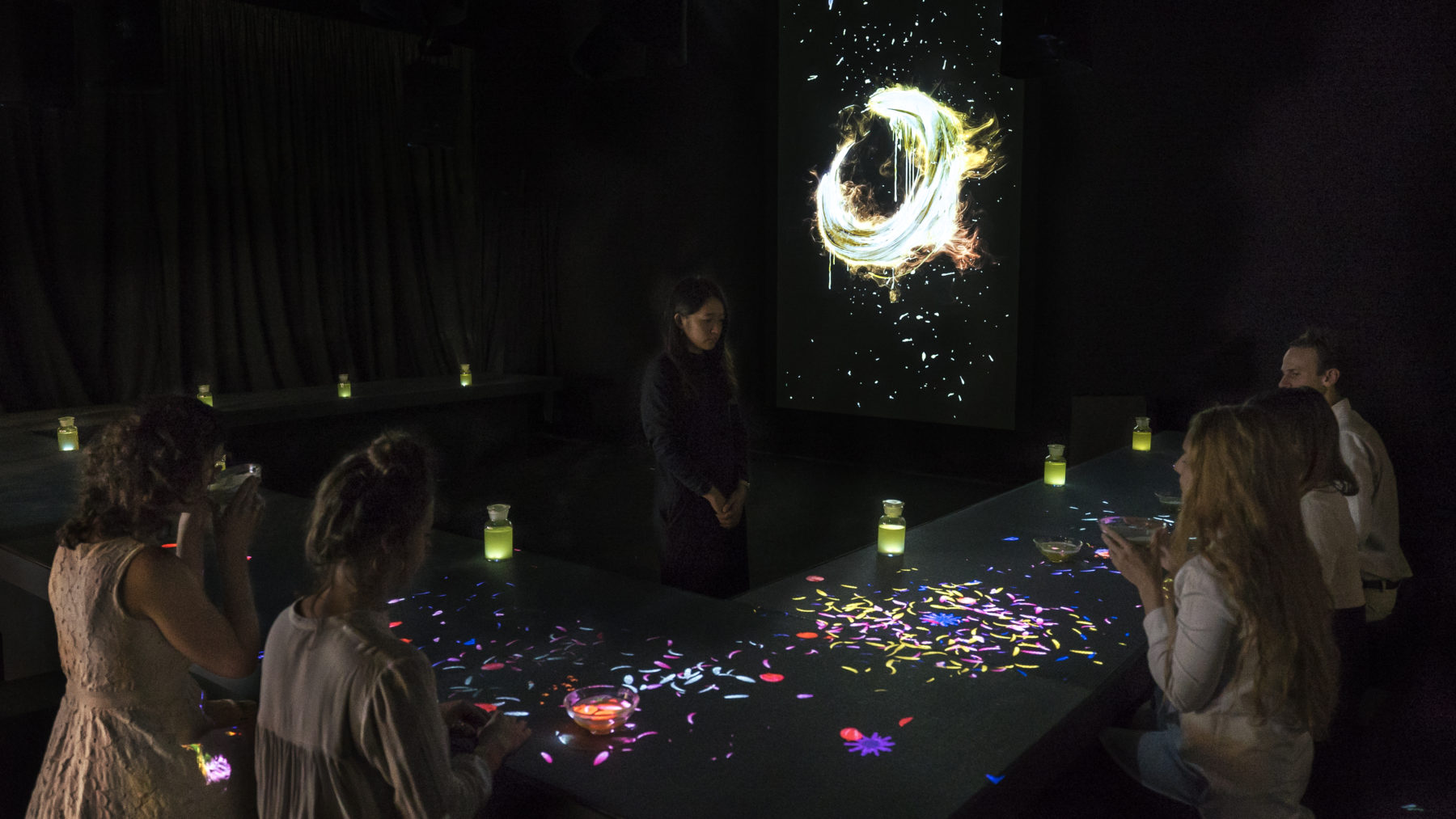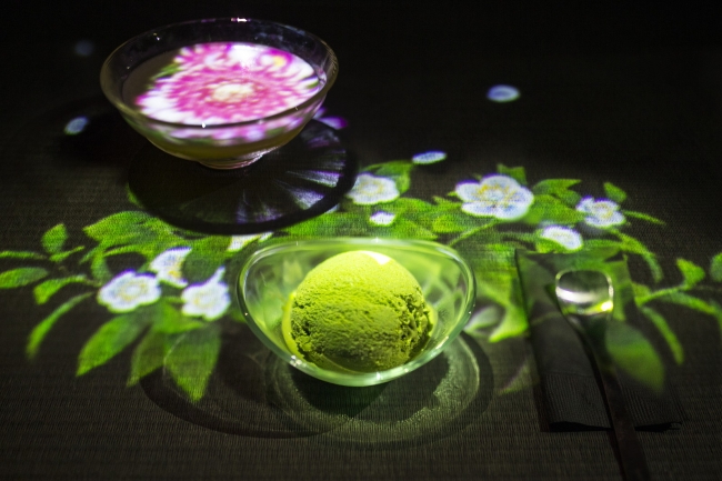スタッフがお茶を器に注ぐと、お茶に鮮やかな花が咲き始める。一口飲むごとに器に浮かんでいた花は散り、テーブルに舞う花びら。そして、テーブルに器を置くと、次は違う種類の花が咲く。お茶を楽しむという行為とデジタルアートが融合した、感動的な体験となっている。