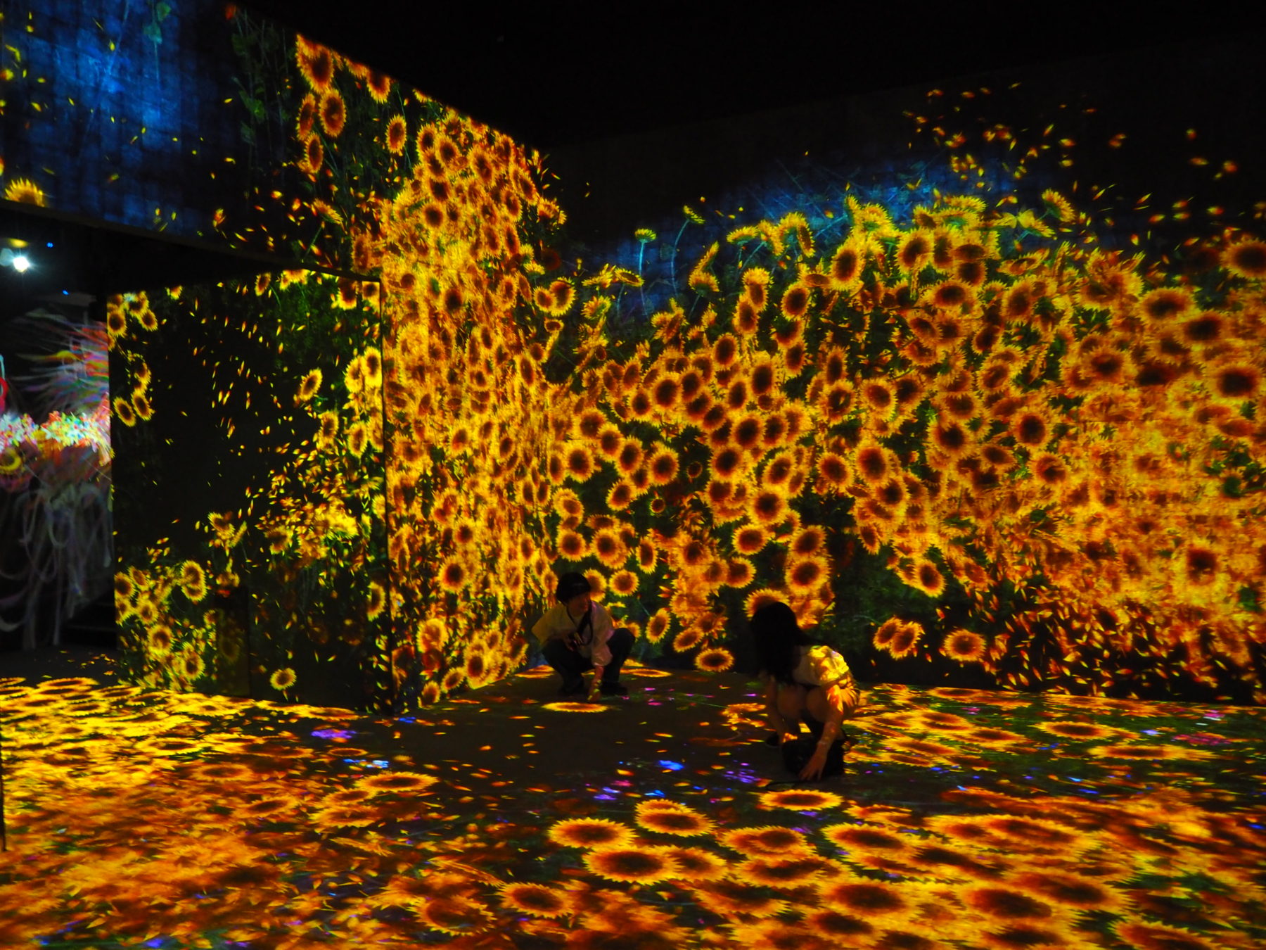 「Borderless World」は、暗闇の空間の中に光線やプロジェクションマッピングによる作品が出現。ヒマワリやアジサイに包まれたり、滝のような青白い光線を浴びたり、蛍の光や水の底の魚に囲まれるなど、いくつもの色鮮やかな世界が広がっている。