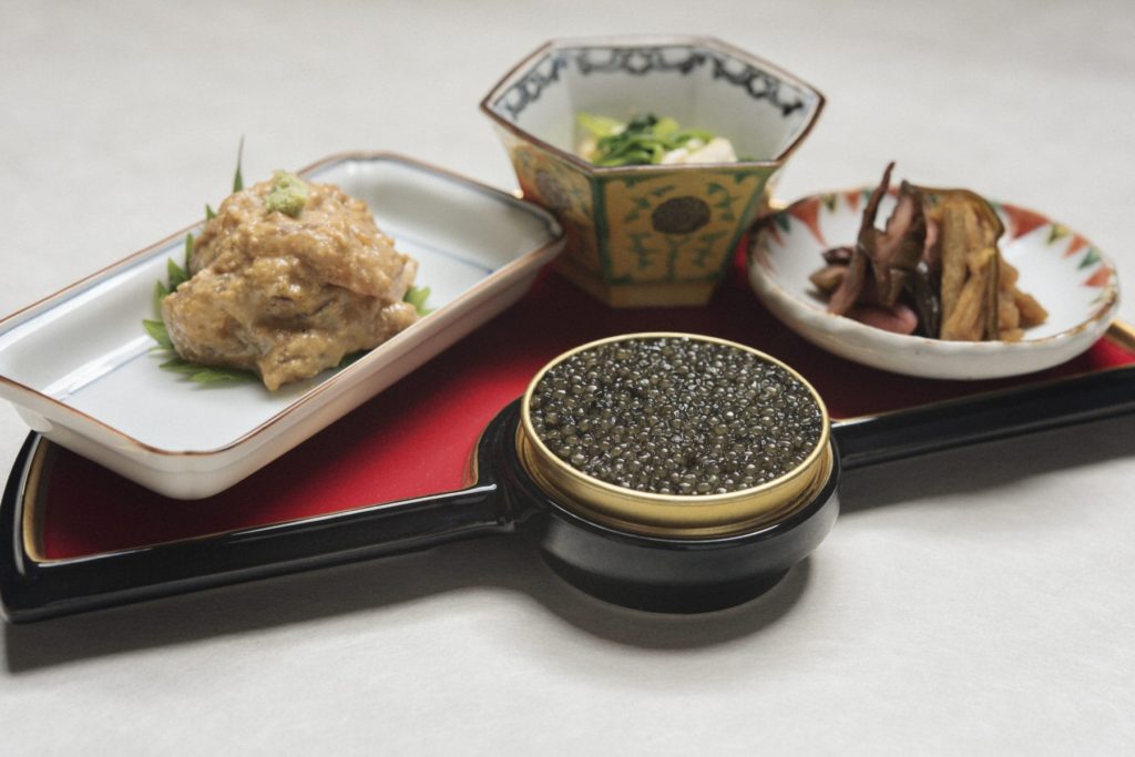 コースでの提供となり、キャビアだけでなく、定番人気の鯛の胡麻だれ和えや抹茶も味わえます。