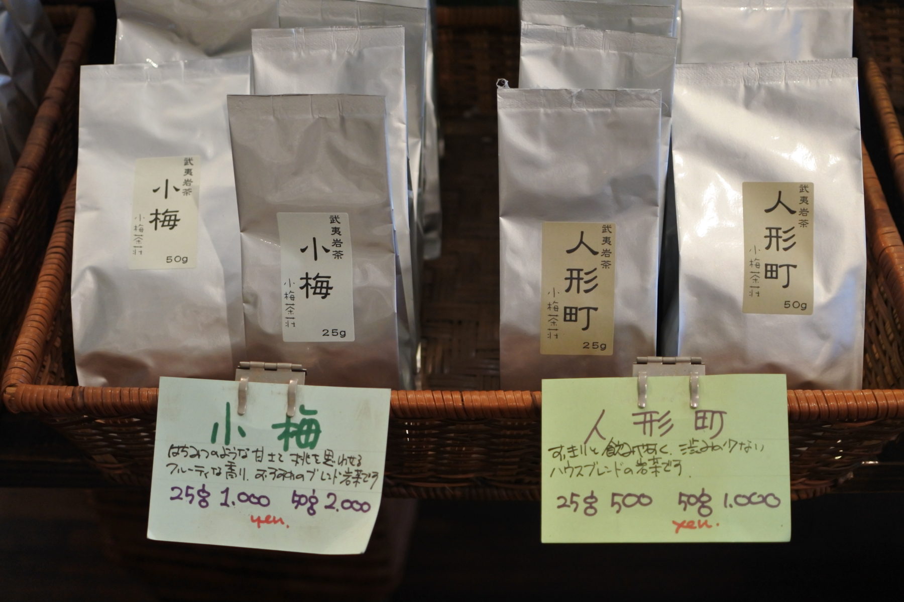 店内の茶葉で2つだけ、小梅茶荘のオリジナルブレンドがある。それが「人形町」と「小梅茶荘」だ。この2つの商品だけは、どんなに原材料や人件費が高くなっても、当初から値段を変えていないのだという。そのお話に、おふたりの、「人形町のお茶屋さん」としての信念が垣間見えた気がした。