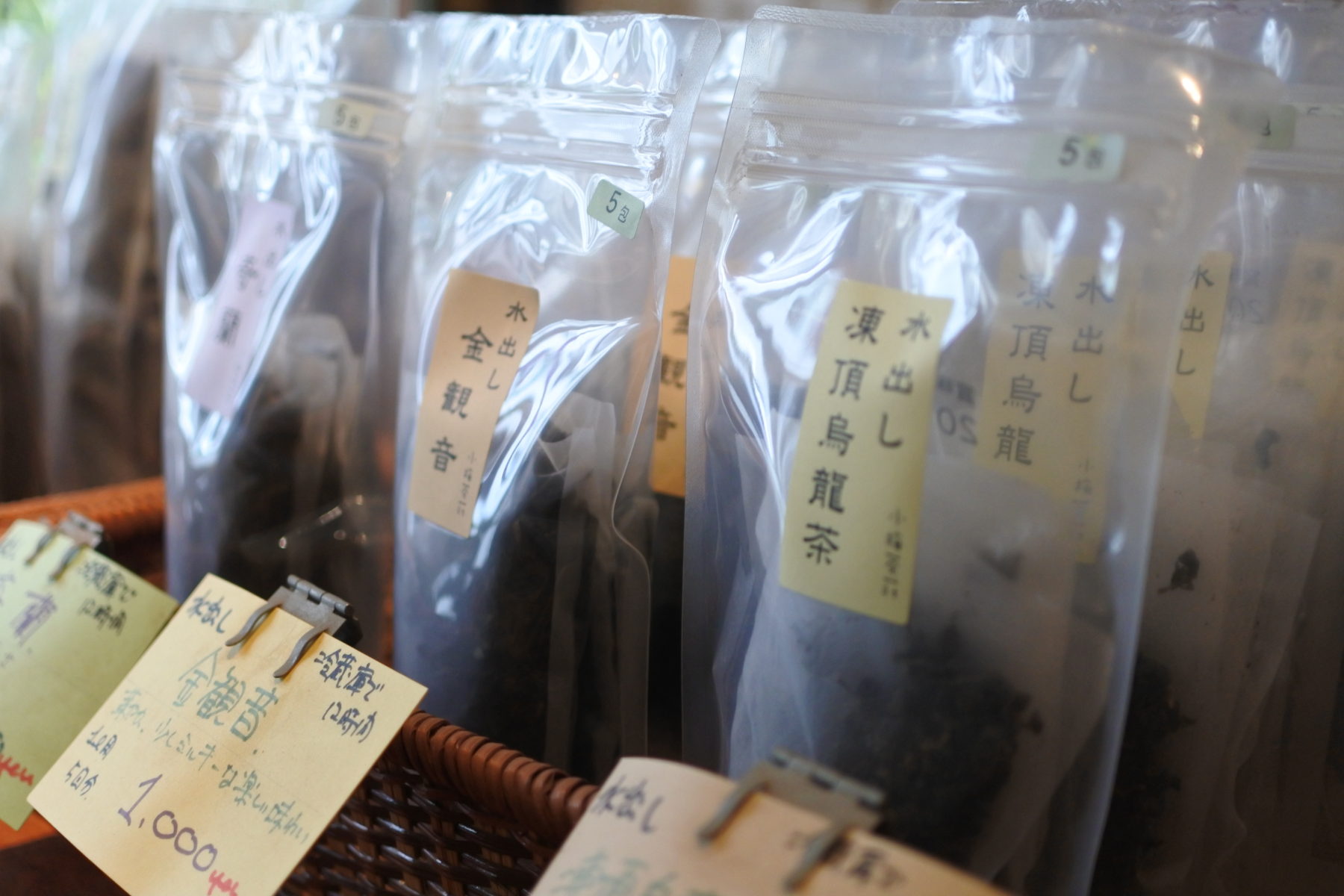 「ここは何のお店ですか?」と聞かれることもしばしば。ご近所さんからの要望で作り始めたティーバッグ商品や、水出し用の茶葉。何を買ってよいかわからない人のための親切なお試しセット。小梅さんと番頭さんは、そうした気遣いを欠かさない。開店当初はお客さんが少なく、お店の存在を知ってもらおうと近所でお茶をふるまって歩いたという。「中国茶を知らないお客さんだからこそ、本当に美味しいものでないと買ってくれないと思うんです」と当時のことを思い出しながら小梅さんが思いを語ってくれた。
