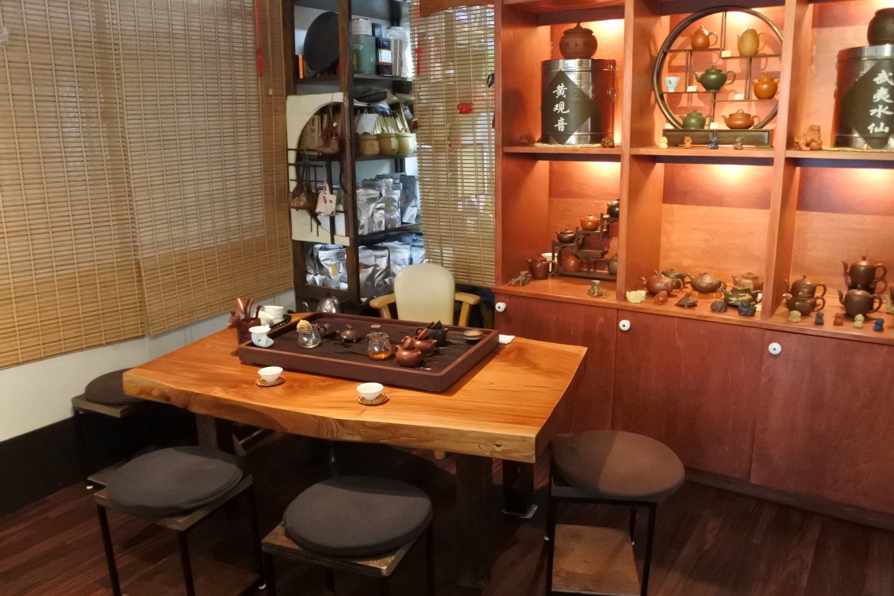 茶葉だけでなく、壁一面に並ぶ中国茶器も本格的なもの。中国の宜興(ぎこう)という場所で採れる土から作った中国の急須、茶壷(チャフー)や、使いやすい磁器の茶器など。どれも高品質のものだが、気になる茶器は手に取って、実際にお湯を淹れてみてもよいと言う。「触ってみないとわからないから」と、おふたりは笑った。