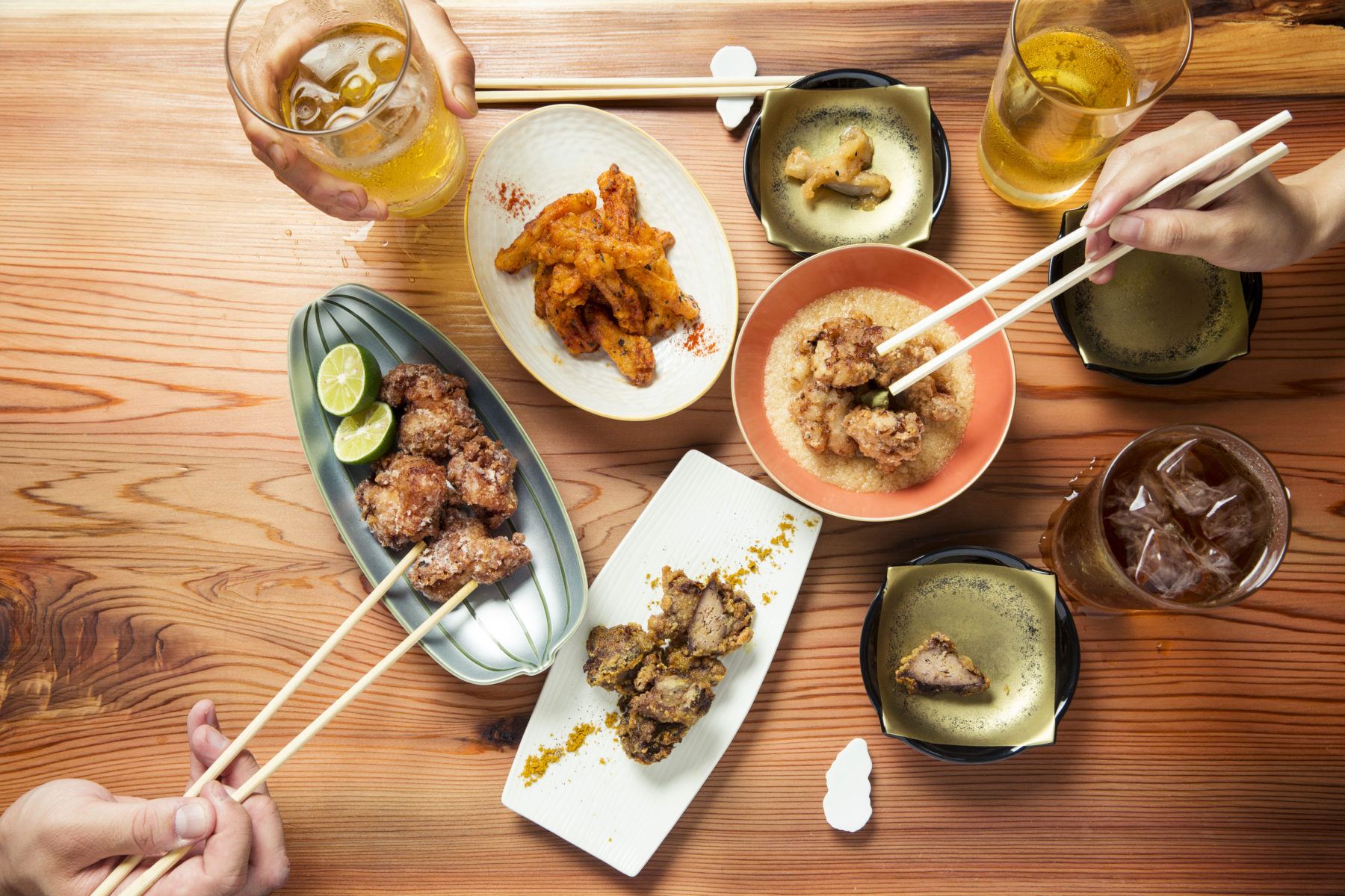 茶割は100種類のお茶割りだけでなく、丁寧に作られたおばんざいなどのフードメニューも充実している。中でも注目なのは「100種類の唐揚げ」。もも、むね、ささみ、砂肝など10種類の部位と、柚子胡椒、カレー、わさび、ペペロンチーノ、パクチーなど10種類の味付けを組み合わせることができる。