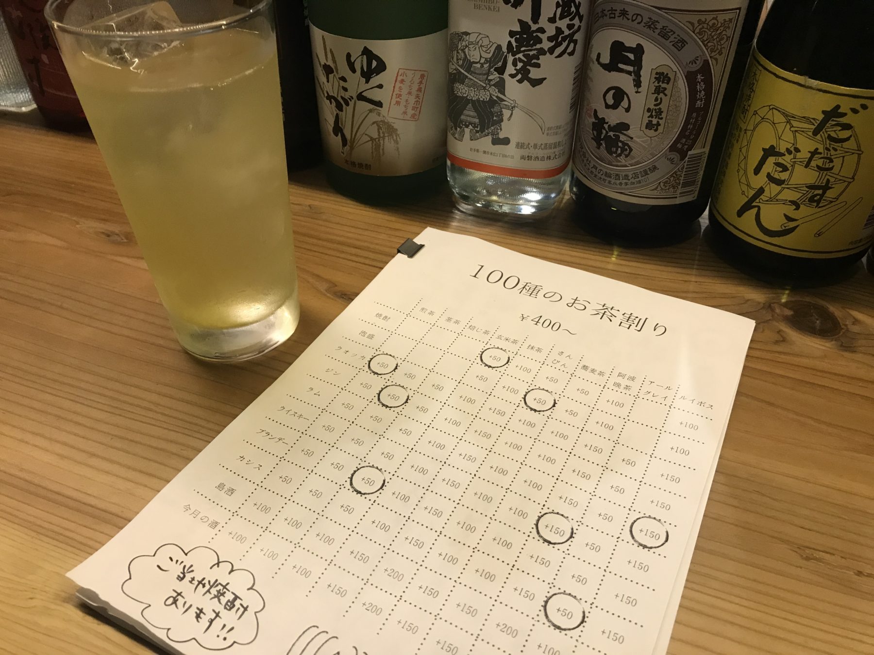 近々、100種類のお茶割りとともに大切な仲間と楽しいひと時を過ごしてみてはいかがだろう。