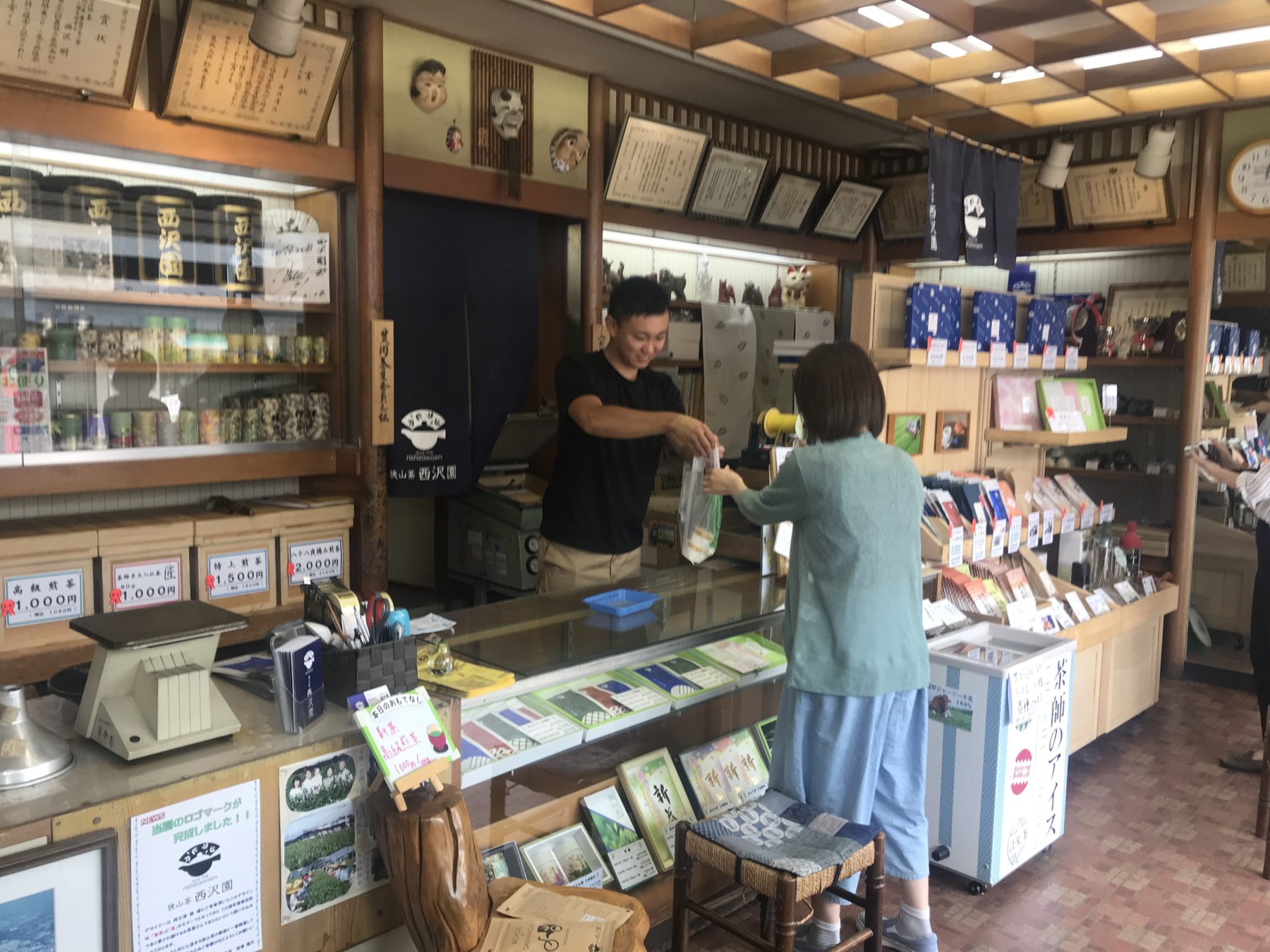 西澤さんは、お茶の収穫時期には茶園で収穫作業を行い、工場で製茶作業に勤しむ。そして、空いた時間を見つけては店頭に立ち、接客し、お客さんに直接お茶を販売している。そんな西澤さんが丹精込めて製茶・販売するお茶を求めて、お客さんが訪れている。
