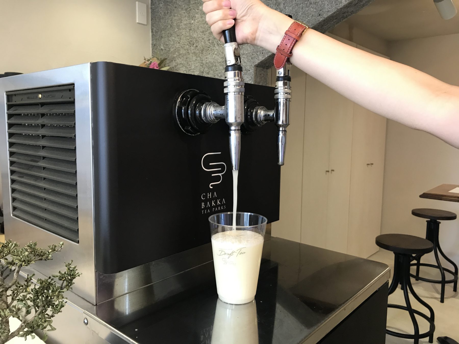 ビールサーバーから直接注ぎ淹れるドラフトビールならぬ、ドラフトティーは日本初の試みで、鹿児島県頴娃産の深蒸し煎茶をじっくりと氷で抽出し、窒素を含ませ1日寝かせて作り提供されている。